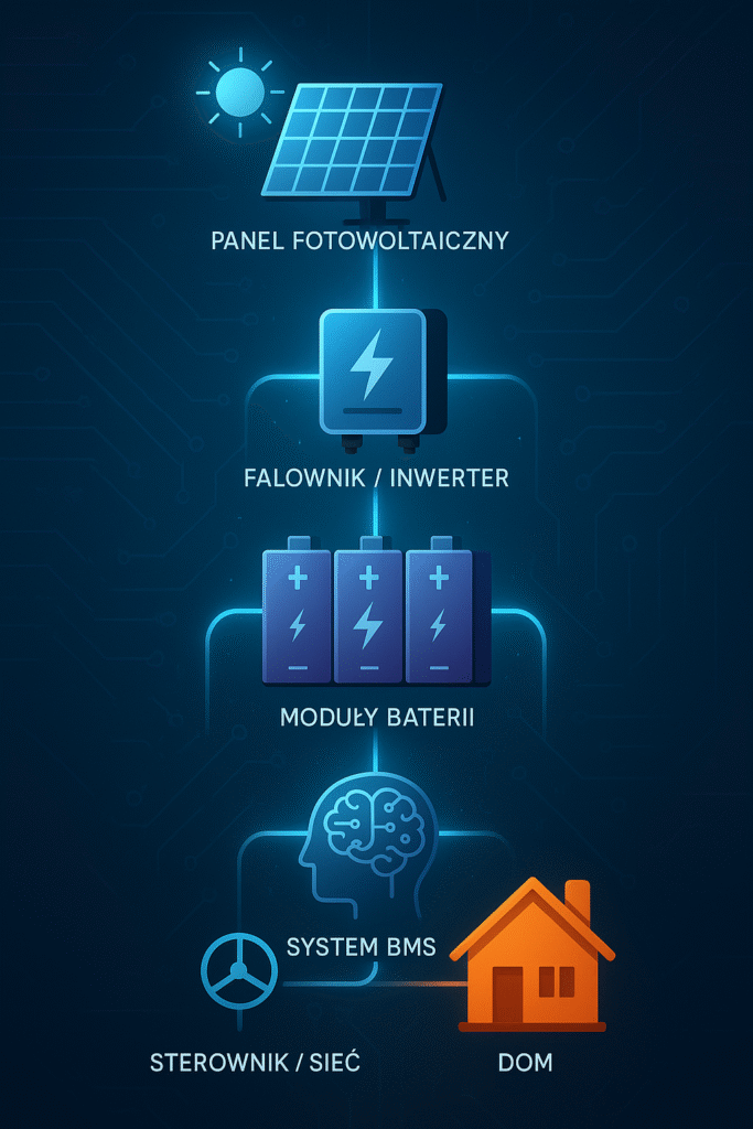 Falownik (inwerter) – przekształca prąd stały (DC) z baterii w prąd zmienny (AC), który zasila urządzenia domowe lub sieć.